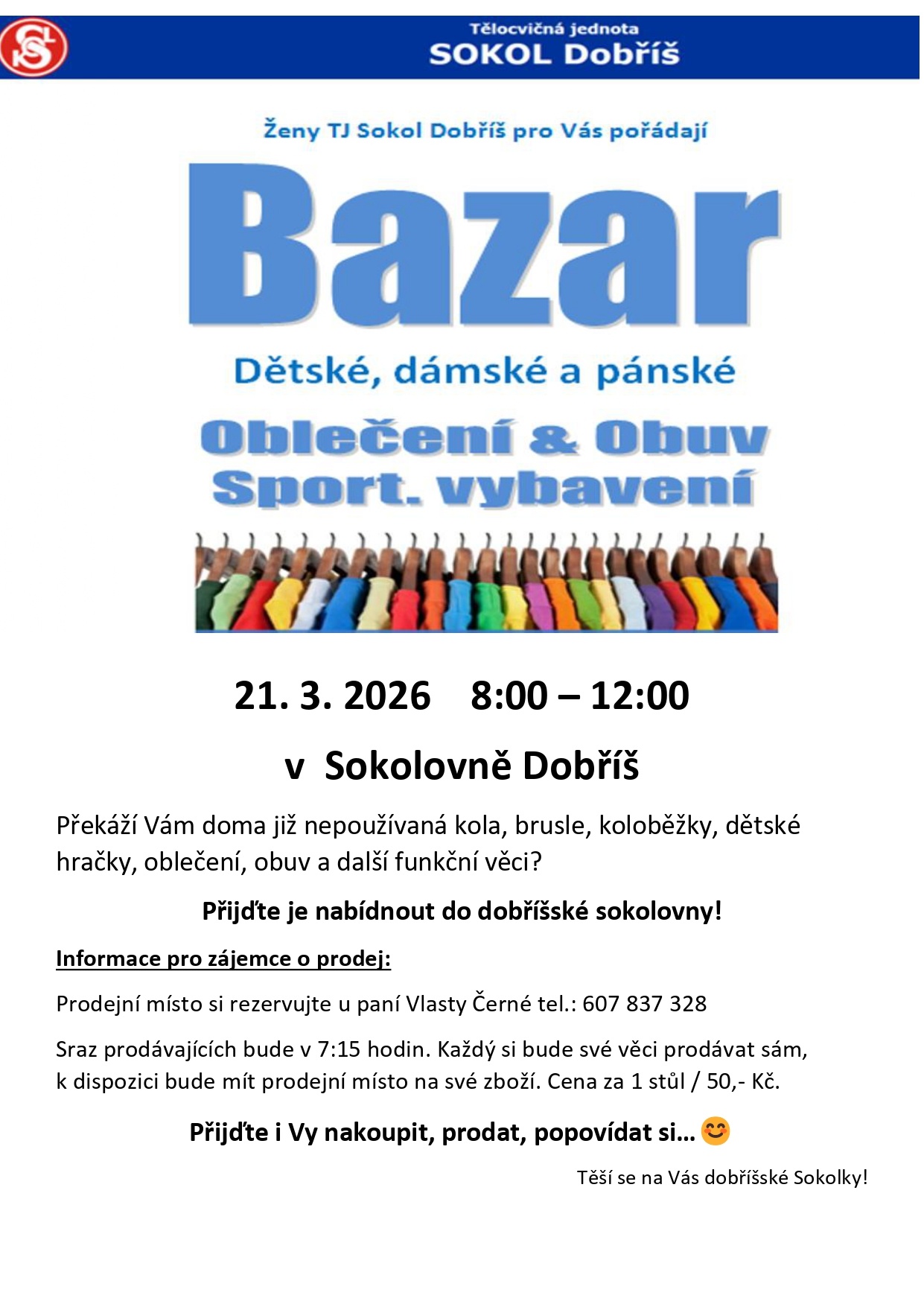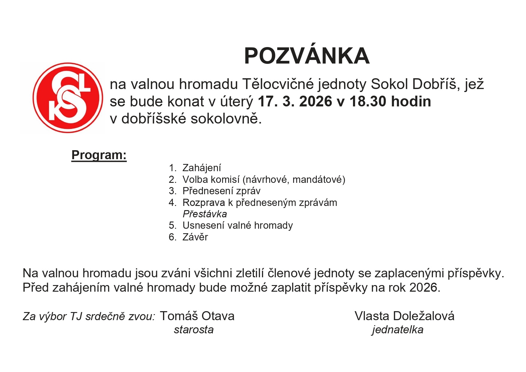 TJ Sokol Dobříš zve své členy na valnou hromadu, která se uskuteční v úterý 17.3. od 18:30.