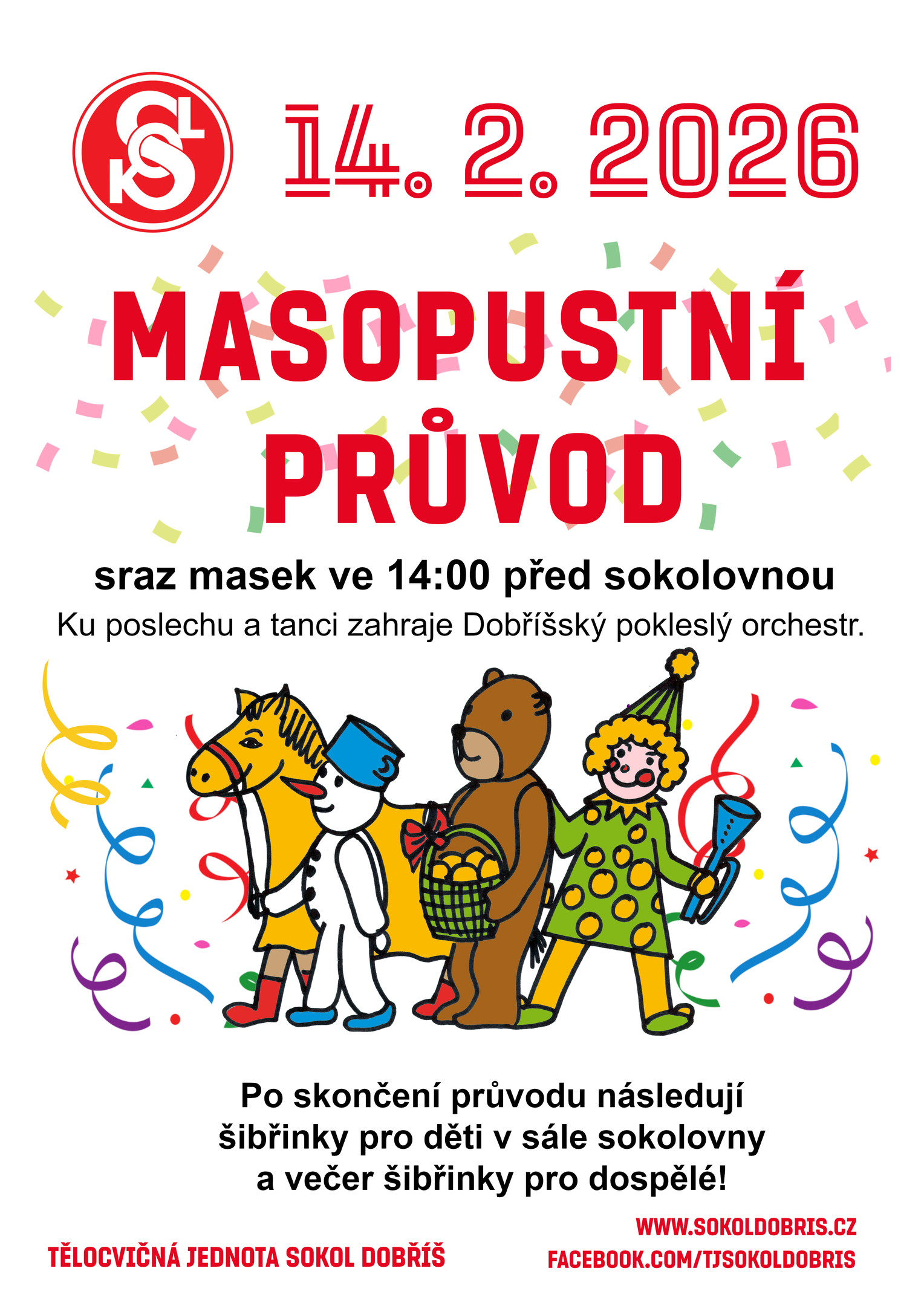 Masopustní průvod městem Dobříš. Sraz masek ve 14:00 před sokolovnou.